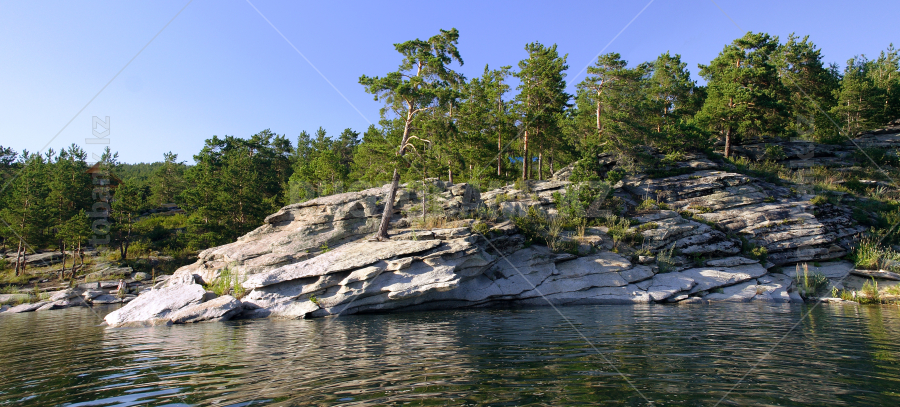 Небольшой скалистый мыс, на котором растут сосны. Голубая бухта. Бухтарминское водохранилище. Казахстан