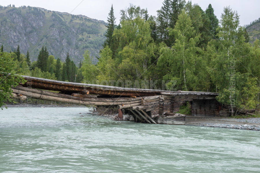Старый деревянный мост из бревен через реку Берель. Алтай, Казахстан.