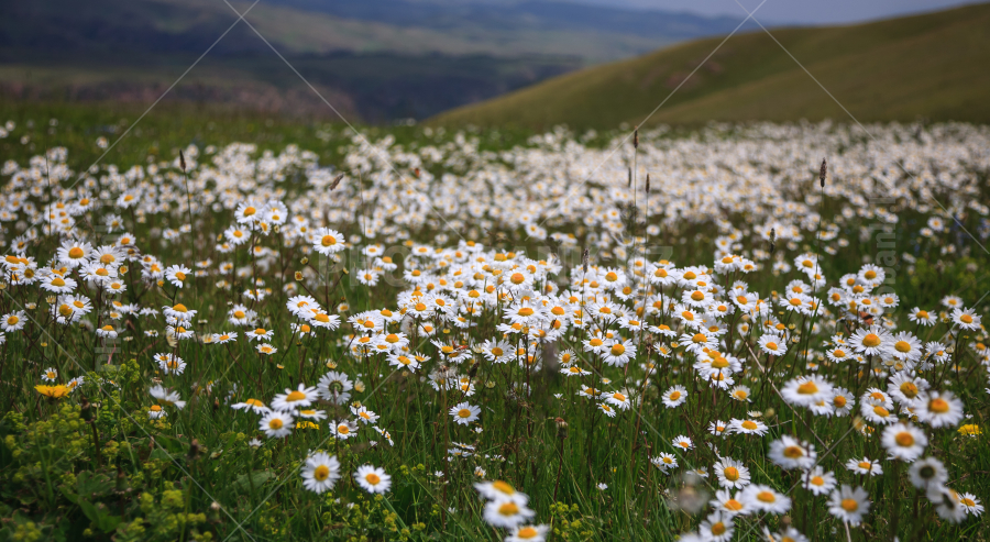Альпийские луга с цветущими ромашками на плато Табан-Карагай