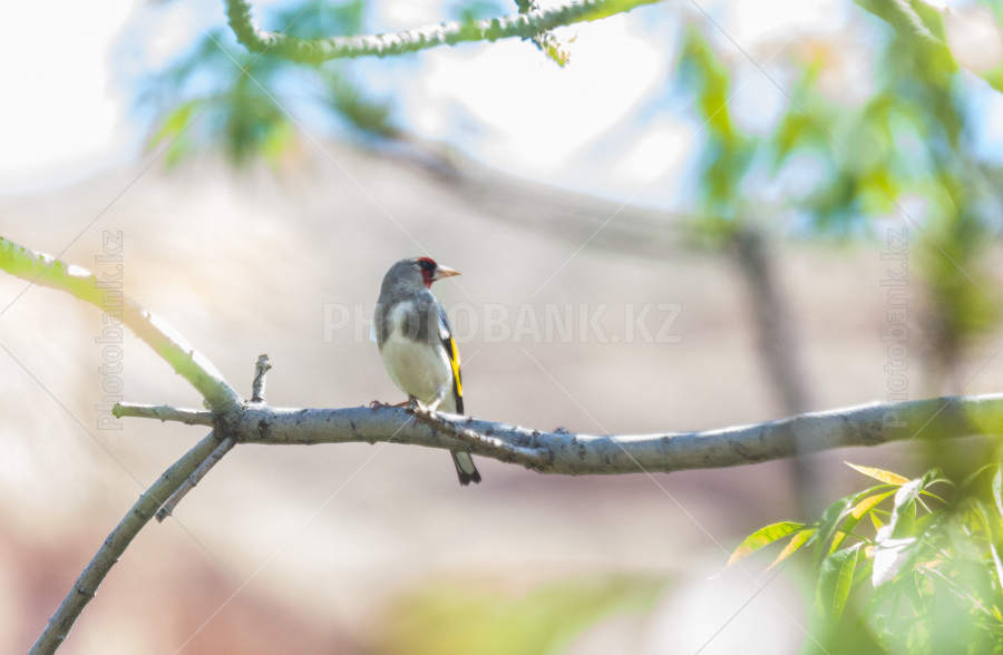 Самец щегла (Carduelis caniceps) сидит на ветке ясеня. Казахстан, река Тимерлик.