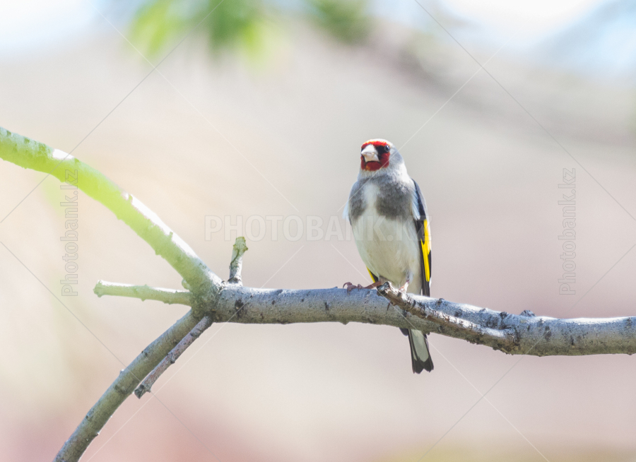 Самец щегла (Carduelis caniceps) сидит на ветке ясеня. Казахстан, река Тимерлик.