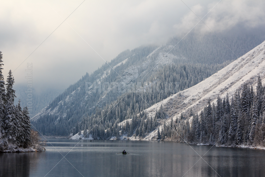 Горное озеро после снегопада. Озеро Кульсай, Казахстан.