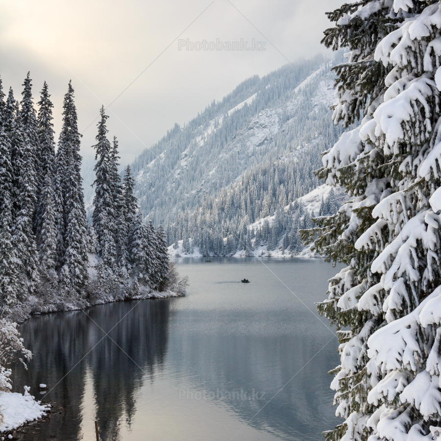 Горное озеро после снегопада. Озеро Кульсай, Казахстан.
