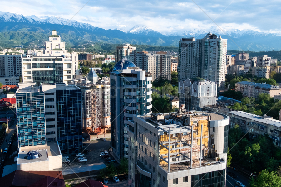 Алматинские высотки на фоне гор Заилийского Алатау.