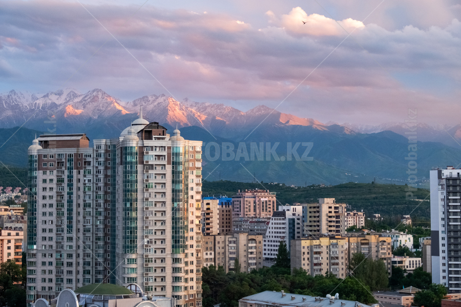 Алматинские высотки на фоне гор Заилийского Алатау.