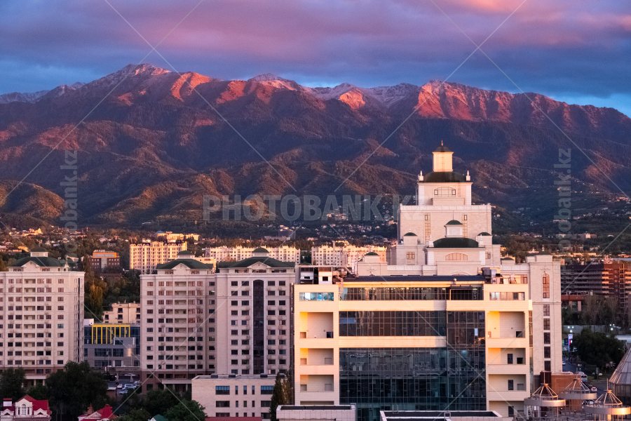 Алматинские высотки на фоне гор Заилийского Алатау.