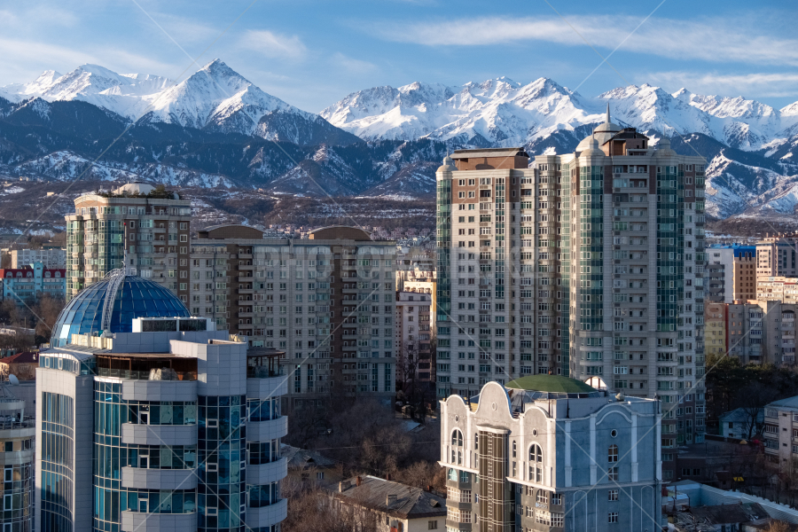 Алматинские высотки на фоне гор Заилийского Алатау.