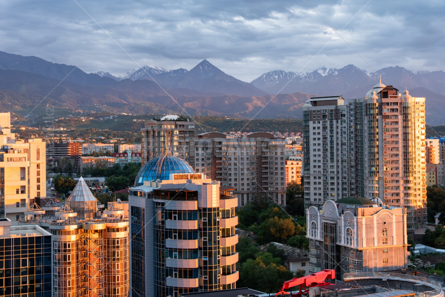 Алматинские высотки на фоне гор Заилийского Алатау.