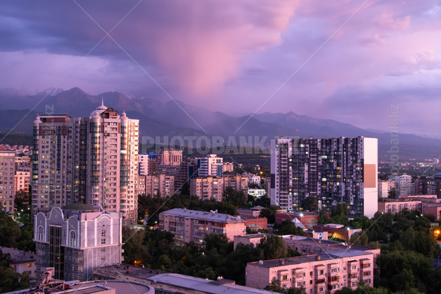 Алматинские высотки на фоне гор Заилийского Алатау.