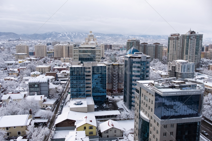 Город Алматы зимой после снегопада.