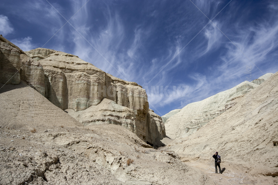 Актау - разноцветные слоистые горы в Национальном парке "Алтын-Емель". Фотограф снимает пейзаж.