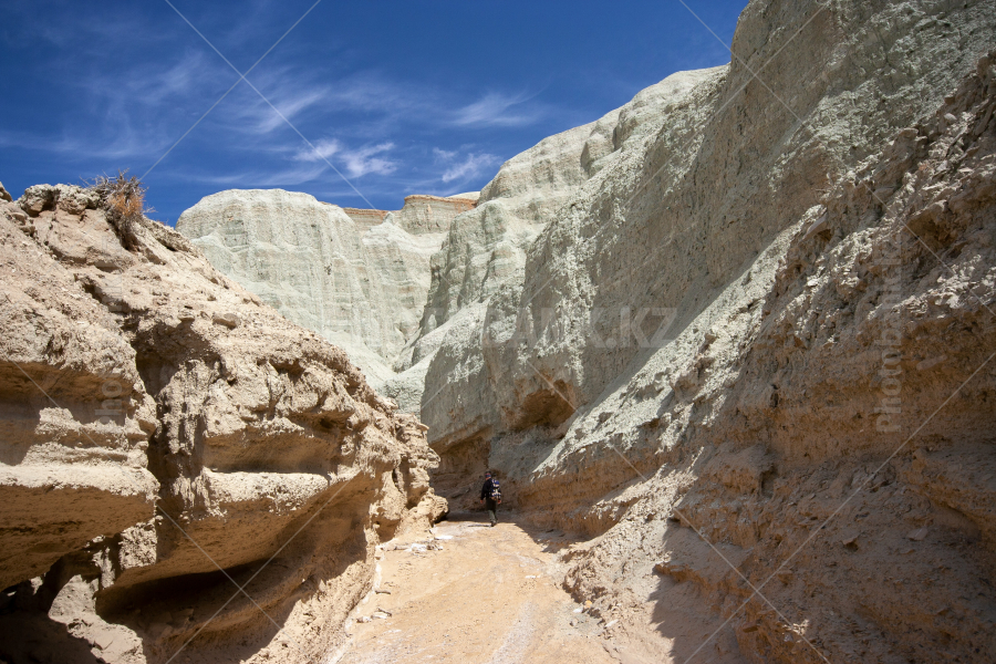 Актау - разноцветные слоистые горы в Национальном парке "Алтын-Емель". Турист идёт по дну каньона.