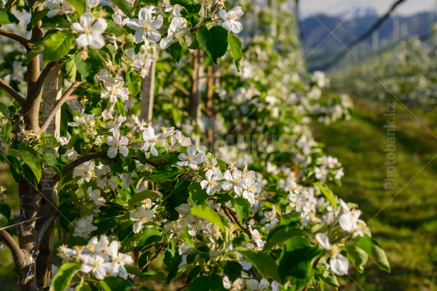 Modern technological apple orchard in spring.