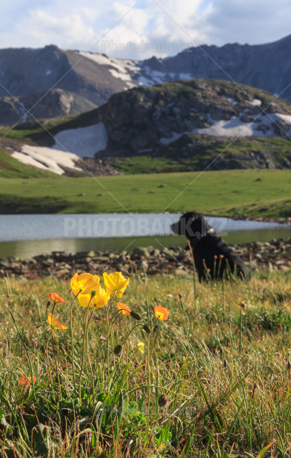 Собака сидит на цветущем альпийском лугу (в фокусе - цветы на переднем плане).
