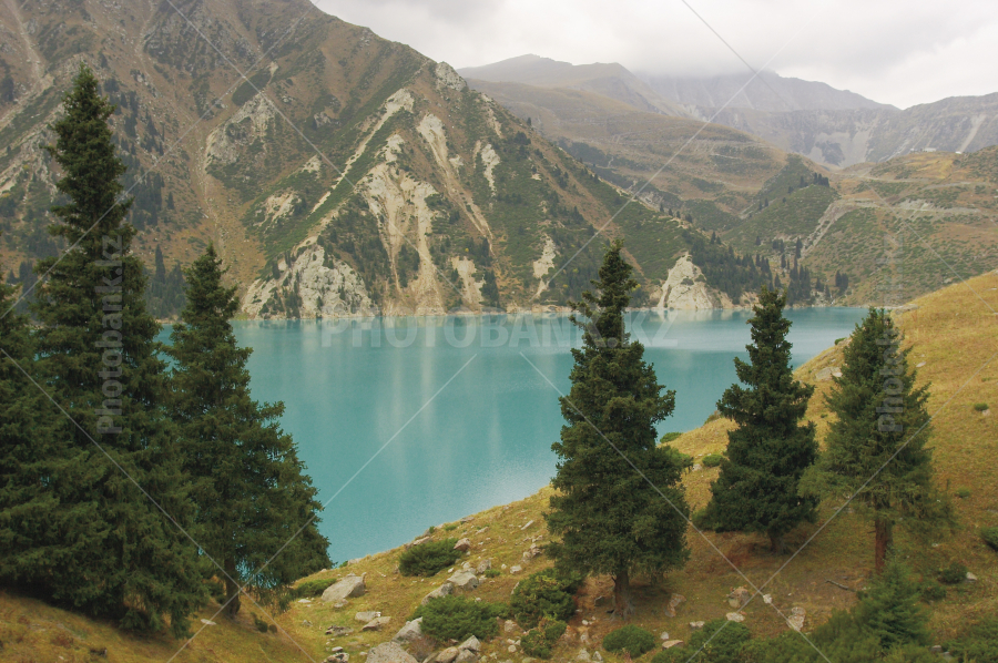 mountain lake at cloudy weather. Big Almaty lake, Kazakhstan.