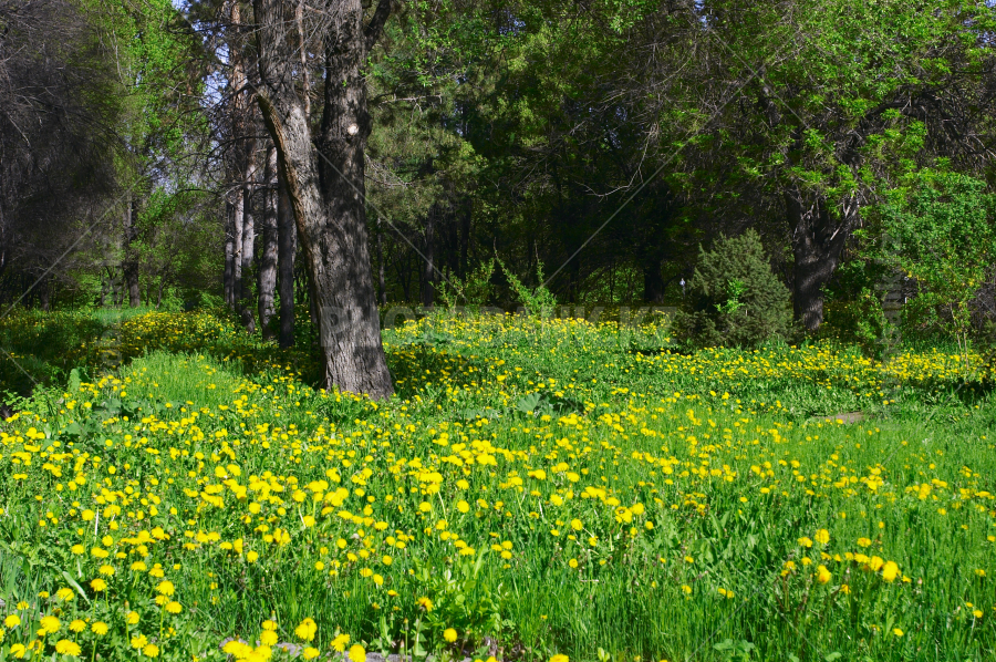 Yellow dandelions among bushes and trees
