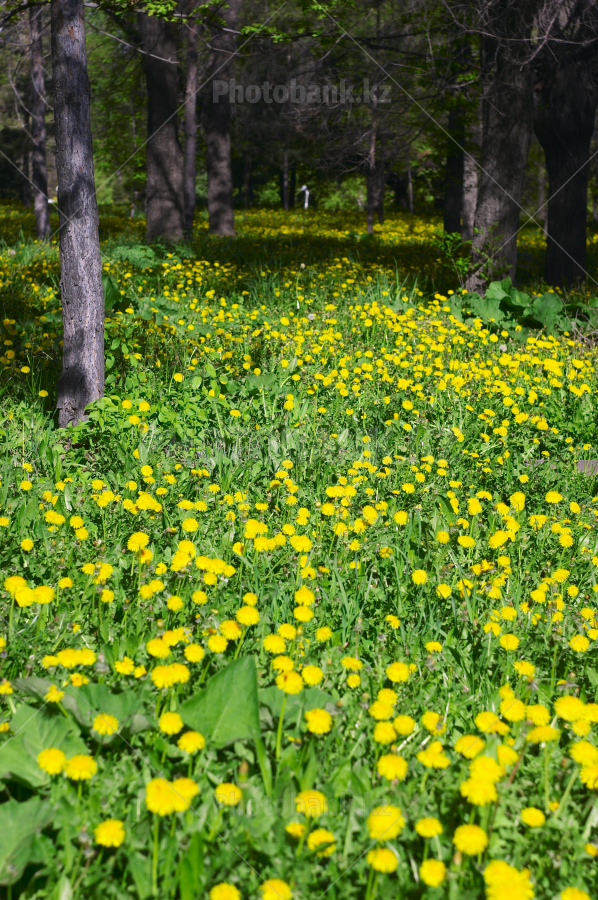 Yellow dandelions among trees