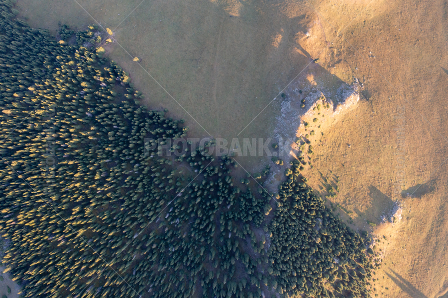 Тяньшанские ели на склонах гор. Ответвления долины реки Асы. Вид сверху