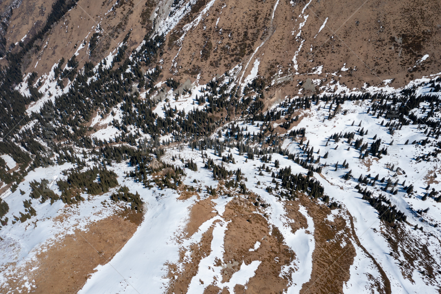 Склоны гор Заилийского Алатау, поросшие тяньшанскими елями. Вид с высоты птичьего полёта.