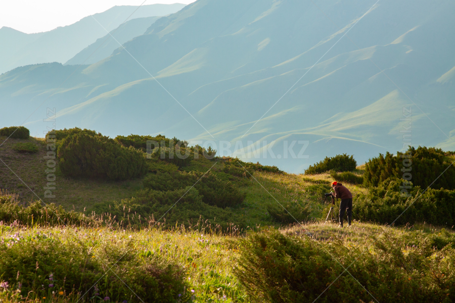 Фотограф с фотоаппаратом на штативе снимает горный пейзаж