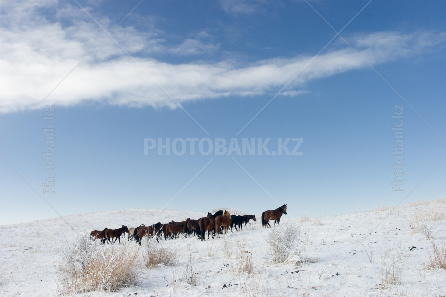 Horses run on hills. Winter.