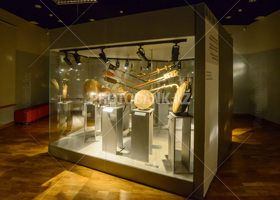 Музей казахских национальных инструментов/Алматы, Казахстан - 10 апреля 2014 г.; Выставка различных видов казахских народных музыкальных инструментов