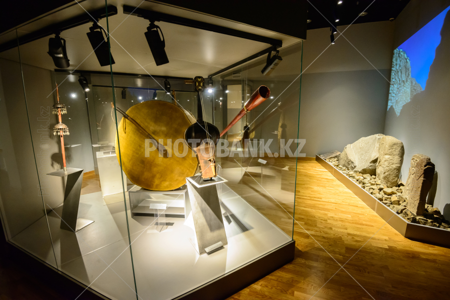 Музей казахских национальных инструментов/Алматы, Казахстан - 10 апреля 2014 г.; Выставка различных видов казахских народных музыкальных инструментов