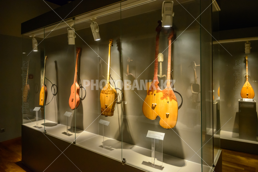 Музей казахских национальных инструментов/Алматы, Казахстан - 10 апреля 2014 г.; Выставка различных видов казахских народных музыкальных инструментов