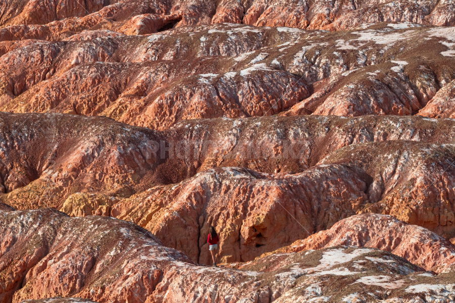 Выходы разноцветных геологических пород..Девушка прогуливается среди разноцветных скал Кеин-кериша.