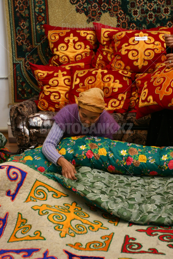 ALMATY, KAZAKHSTAN - January 30: Unidentified Kazakh needlewoman handle wool on January 30, 2006 in Turgen (Almaty district), Kazakhstan. Woman pick litter from sheep's wool and cloth.