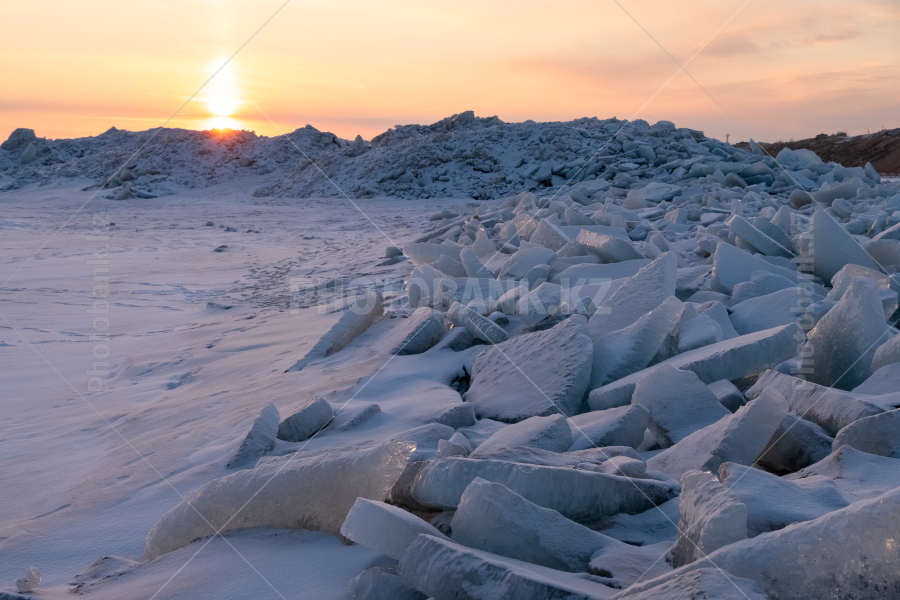 Ледяные торосы на берегу Капчагайского водохранилища