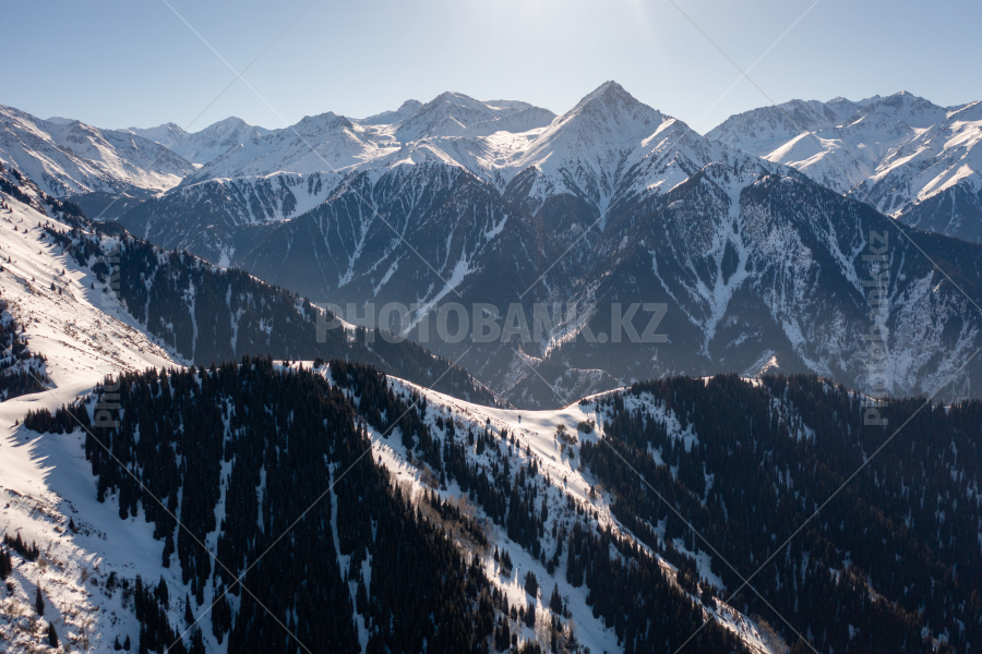 Склоны гор Заилийского Алатау, поросшие тяньшанскими елями. Вид с высоты птичьего полёта.