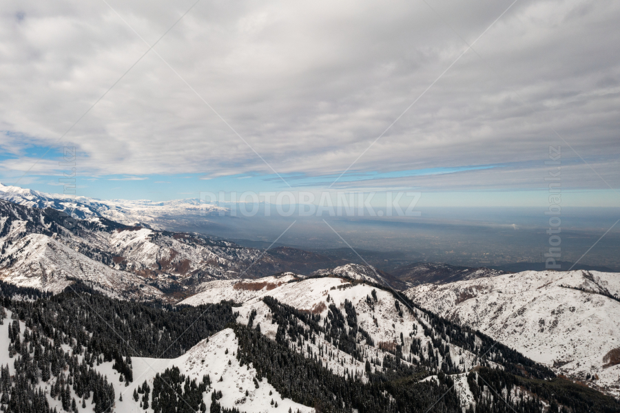 Склоны гор Заилийского Алатау, поросшие тяньшанскими елями. Вид с высоты птичьего полёта.