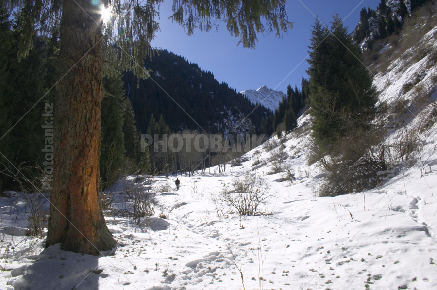 Mountain ravine in the winter. People go on a track.