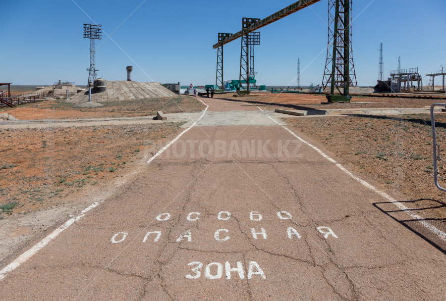 The launch pad of the Zenit-M rocket (now the Baiterek launch complex) at the Baikonur Cosmodrome. Sign "Particularly dangerous area"