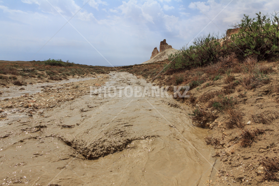 После сильных дождей сухое русло превратилось в бурный поток. Босжира. Мангистау. Казахстан
