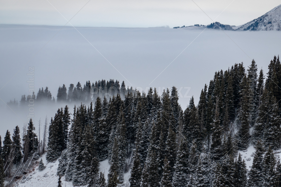 Низкая облачность наползает на поросшие тяньшанскими елями склоны Заилийского Алатау. Окрестности Алматы.
