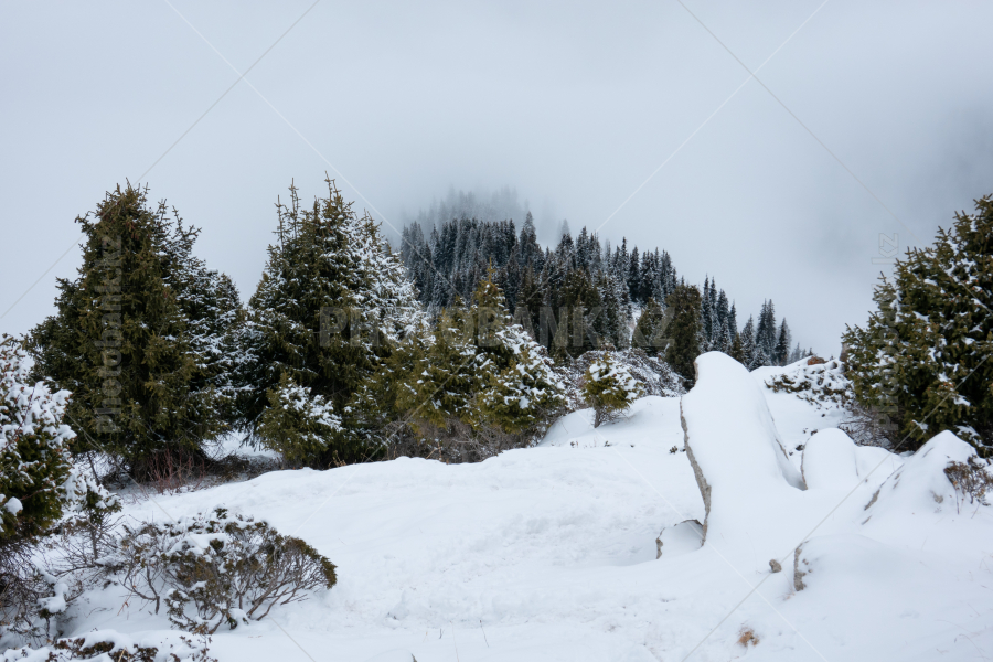 Низкая облачность наползает на лесистые склоны Заилийского Алатау. Окрестности Алматы.