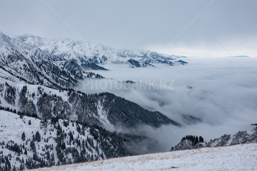 Низкая облачность наползает на лесистые склоны Заилийского Алатау. Окрестности Алматы.