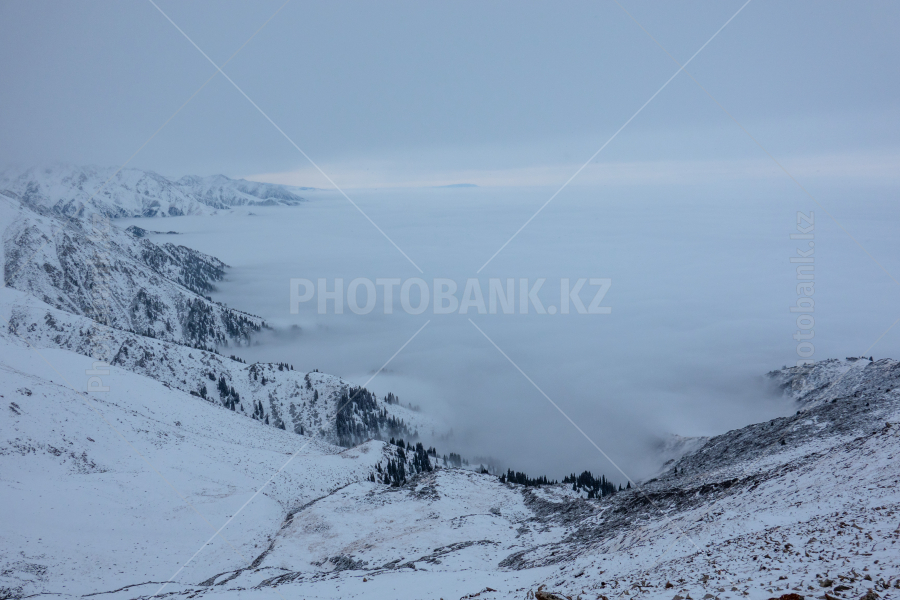 Низкая облачность наползает на лесистые склоны Заилийского Алатау. Окрестности Алматы.