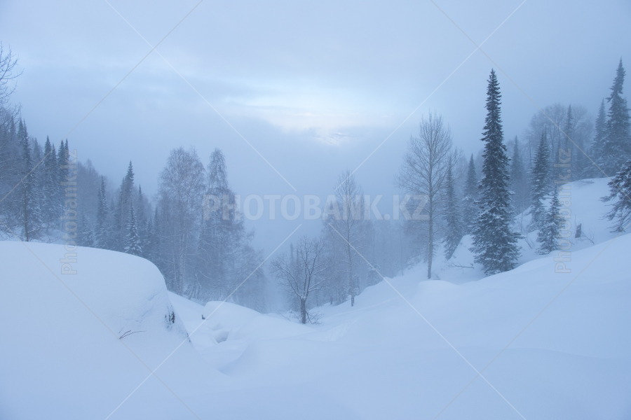 Низкая облачность наползает на лесистые склоны Заилийского Алатау. Окрестности Алматы.