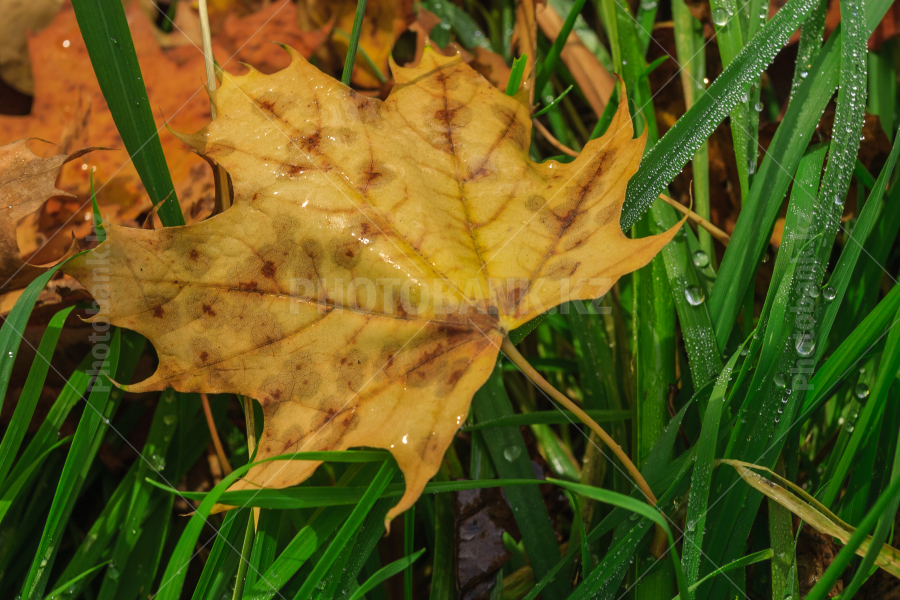 Maple leaf lying in the grass, covered with dew.