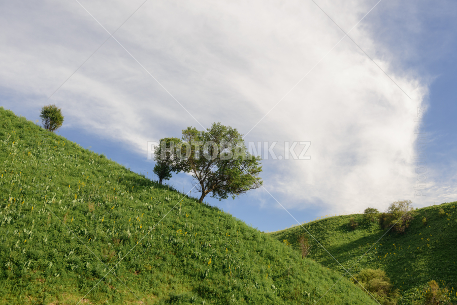Зеленые предгорья с деревьями (окрестности города Алматы)