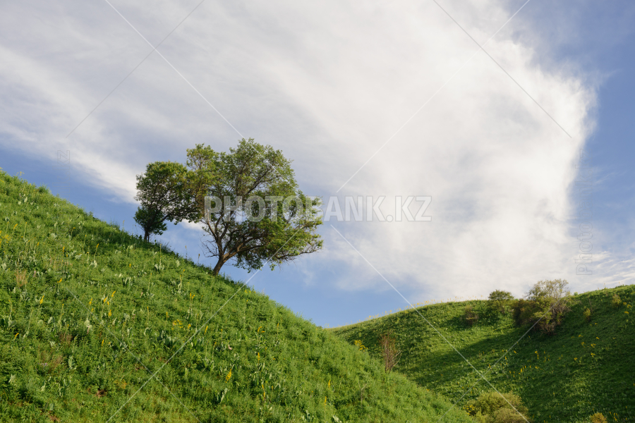 Зеленые предгорья с деревьями (окрестности города Алматы)