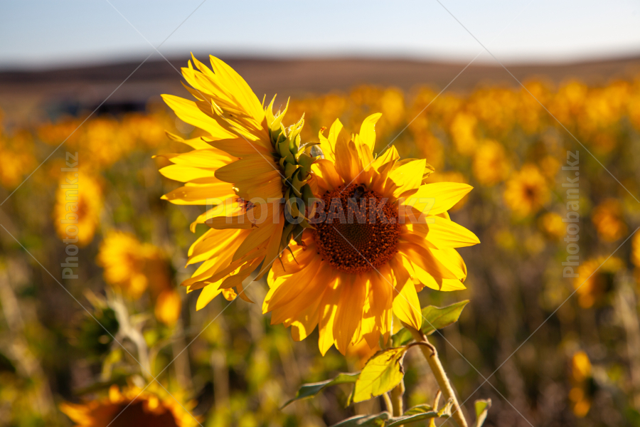 Подсолнухи крупным планом. На цветке сидит пчела.