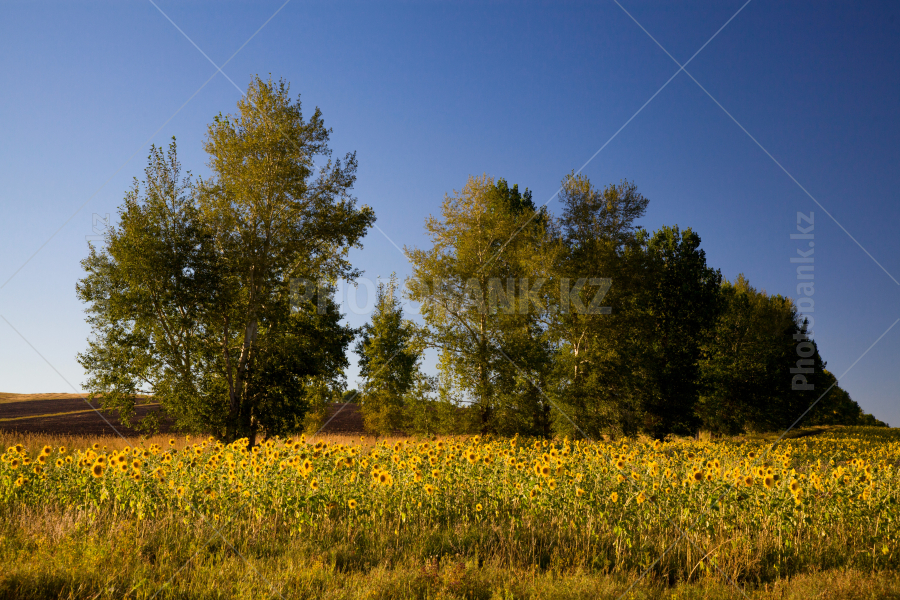 Деревья среди подсолнечных полей.