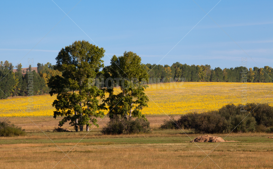 Отдельные деревья на фоне поля цветущих подсолнухов.