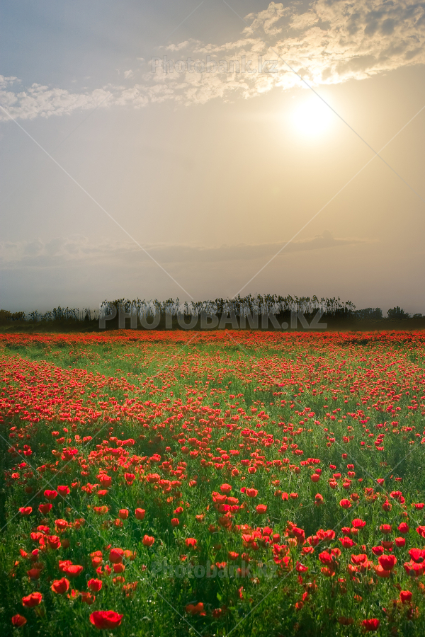 the blossoming poppies at sunset