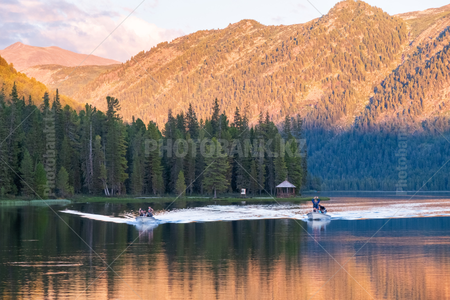 Озеро Рахмановские ключи. Лодки с туристами плывут по зеркальной глади воды.