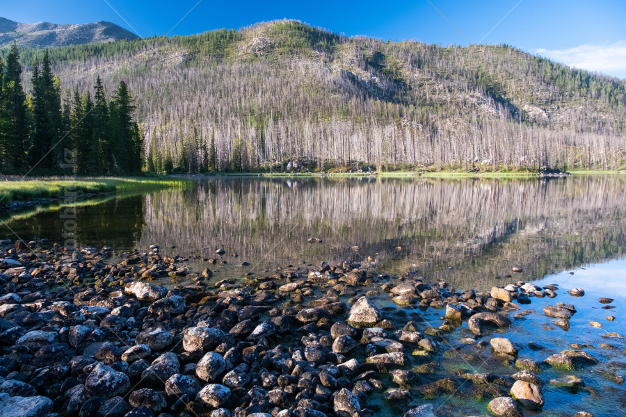 Озеро Рахмановские ключи. Горы отражаются в воде.